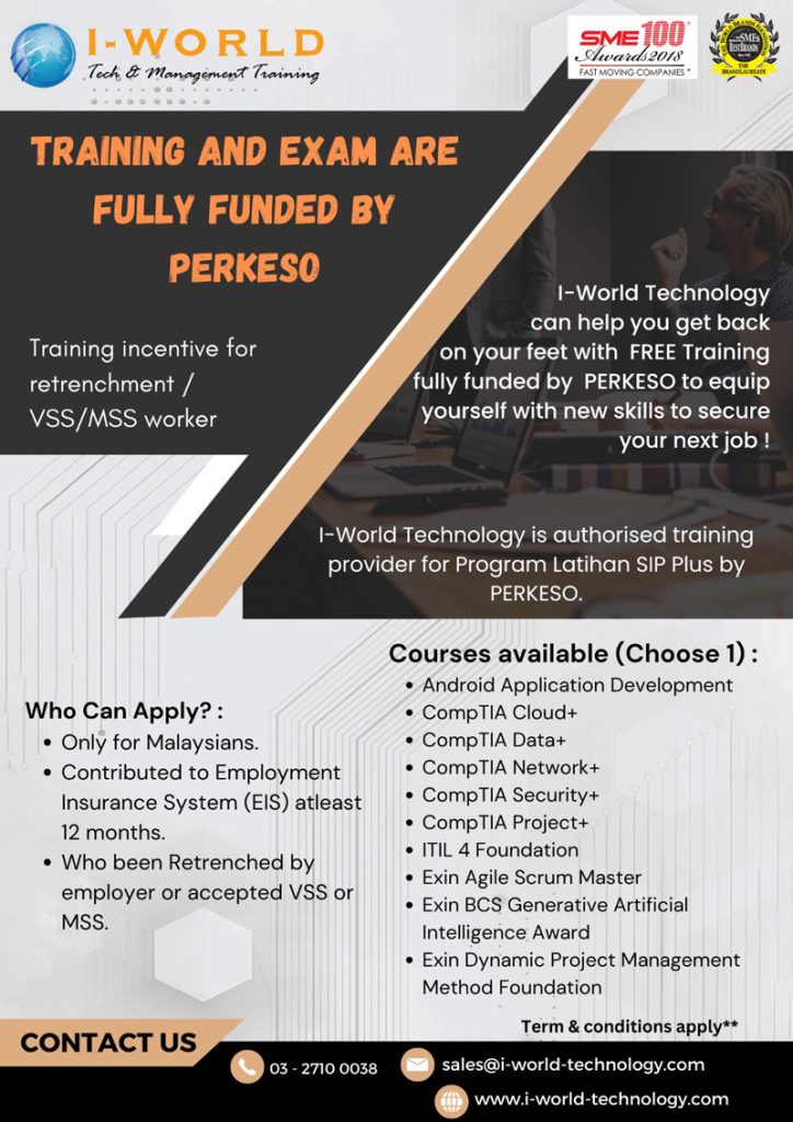 I-World Technology can help you get back on your feet with FREE Training fully funded by PERKESO to equip yourself with new skills to secure your next job ! I-World Technology is authorised training provider for Program Latihan SIP Plus (EIS) by PERKESO.